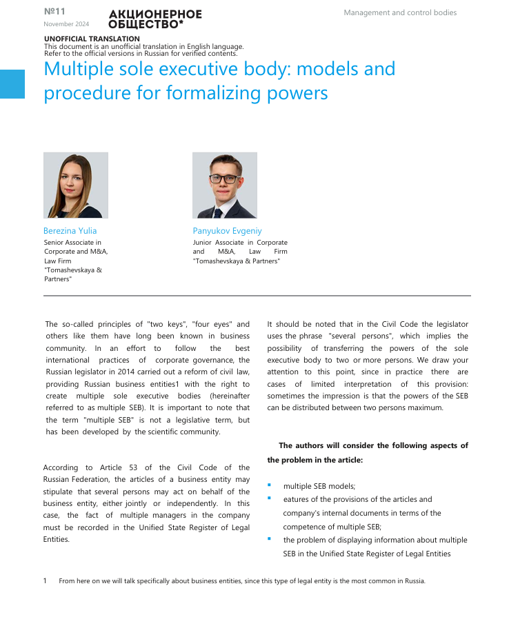 The so-called principles of "two keys", "four eyes" and others like them have long been known in business circles. In an effort to follow the best international practices of corporate governance, the Russian legislator in 2014 carried out a reform of civil law, providing Russian business entities1 with the opportunity to create multiple sole executive bodies (hereinafter referred to as multiple sole executive bodies). It is important to note that the term "multiple sole executive bodies" is not a legislative term, but was developed by the scientific community.