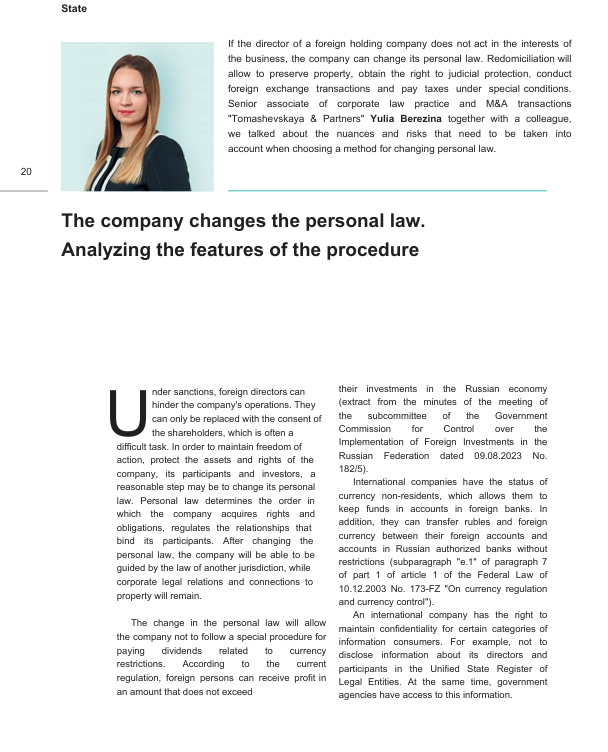 The mechanism of changing a company's personal law (redomiciliation) and incorporation as an effective tool for protecting the rights of the company and its stakeholders in conditions of sanctions and unstable political circumstances. It examines the specifics of obtaining the status of an international company (IC), the advantages and disadvantages of redomiciliation and incorporation, as well as practical aspects of these procedures, including management, tax benefits, investment requirements, and registration periods.