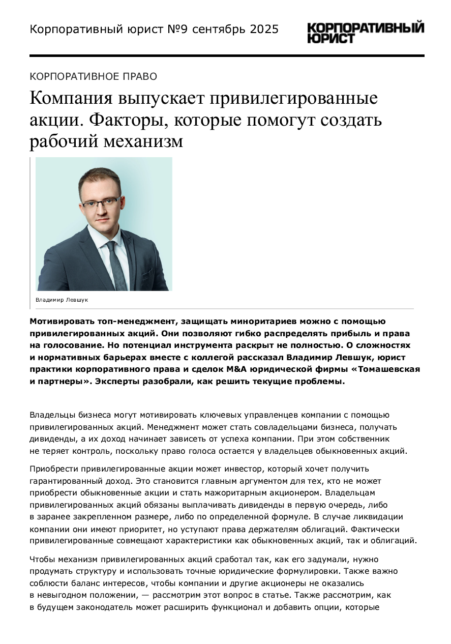 Мотивировать топ-менеджмент, защищать миноритариев можно с помощью привилегированных акций. Они позволяют гибко распределять прибыль и права на голосование. Но потенциал инструмента раскрыт не полностью. О сложностях и нормативных барьерах вместе с коллегой рассказал Владимир Левшук, юрист практики корпоративного права и сделок M&A юридической фирмы «Томашевская и партнеры». Эксперты разобрали, как решить текущие проблемы.