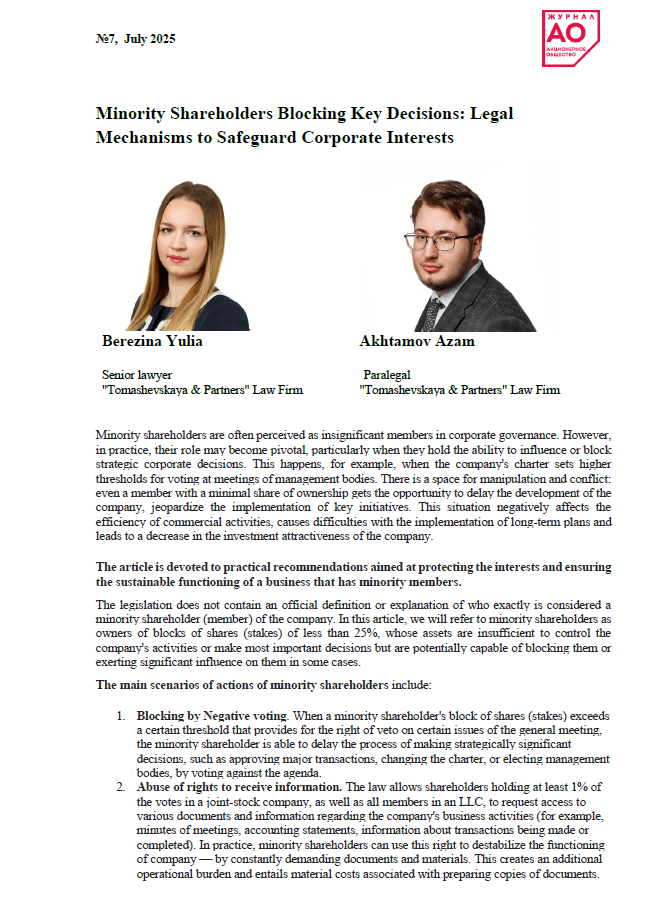 Minority shareholders are often perceived as insignificant members in corporate governance. However, in practice, their role may become pivotal, particularly when they hold the ability to influence or block strategic corporate decisions. This happens, for example, when the company's charter sets higher thresholds for voting at meetings of management bodies. There is a space for manipulation and conflict: even a member with a minimal share of ownership gets the opportunity to delay the development of the company, jeopardize the implementation of key initiatives. This situation negatively affects the efficiency of commercial activities, causes difficulties with the implementation of long-term plans and leads to a decrease in the investment attractiveness of the company.