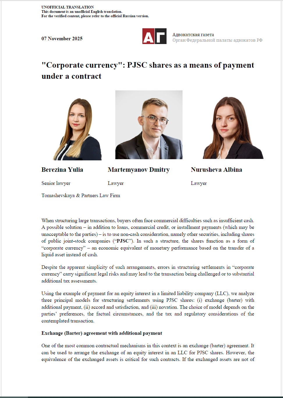 A possible solution – in addition to loans, commercial credit, or installment payments (which may be unacceptable to the parties) – is to use non-cash consideration, namely other securities, including shares of public joint-stock companies (“PJSC”). In such a structure, the shares function as a form of “corporate currency” – an economic equivalent of monetary performance based on the transfer of a liquid asset instead of cash.