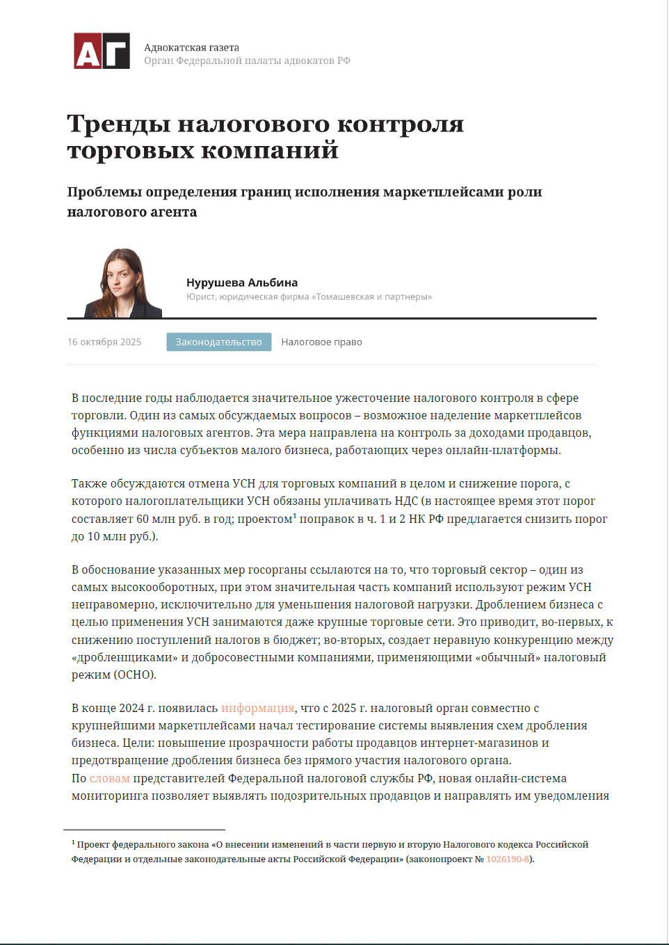 В последние годы наблюдается значительное ужесточение налогового контроля в сфере торговли. Один из самых обсуждаемых вопросов – возможное наделение маркетплейсов функциями налоговых агентов. Эта мера направлена на контроль за доходами продавцов, особенно из числа субъектов малого бизнеса, работающих через онлайн-платформы. Также обсуждаются отмена УСН для торговых компаний в целом и снижение порога, с которого налогоплательщики УСН обязаны уплачивать НДС (в настоящее время этот порог составляет 60 млн руб. в год; проектом поправок в ч. 1 и 2 НК РФ предлагается снизить порог до 10 млн руб.)