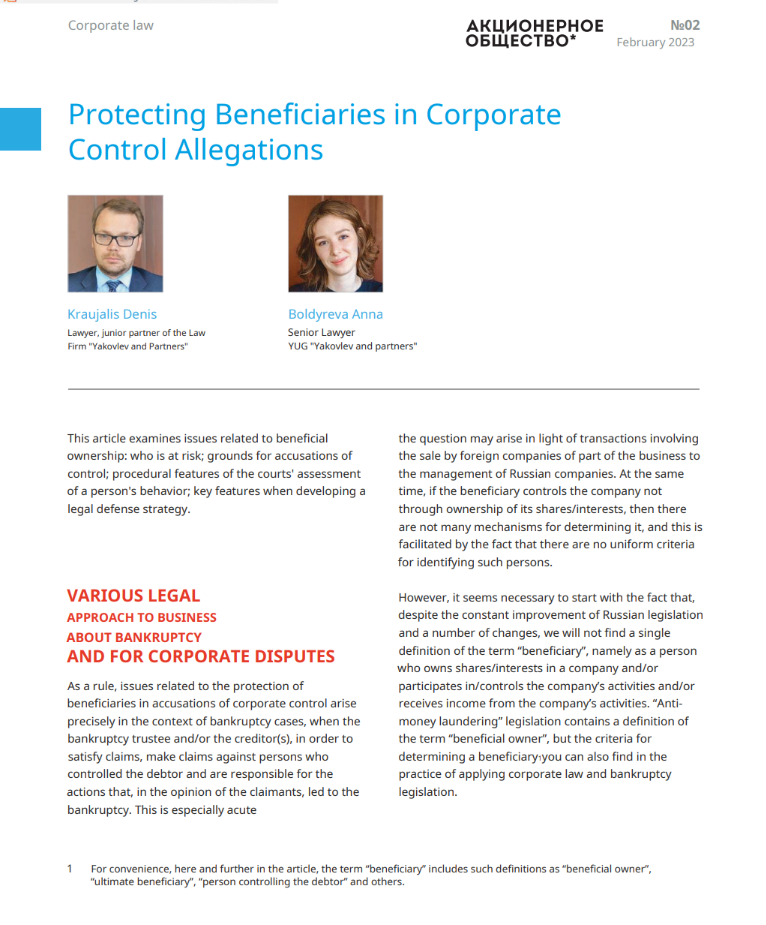 The article focuses on the strategy for defending individuals accused of corporate control. The article examines issues related to the determination of beneficial ownership, procedural peculiarities of assessing the behavior of individuals by courts, as well as key aspects of developing a legal defense strategy. The article also compares approaches in bankruptcy cases and corporate disputes and analyzes judicial practice in determining beneficial ownership and risks associated with accusations of corporate control.