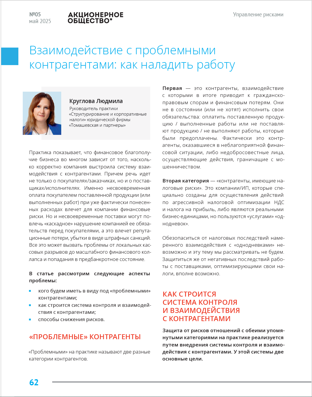 Практика показывает, что финансовое благополучие бизнеса во многом зависит от того, насколько корректно компания выстроила систему взаимодействия с контрагентами. Причем речь идет не только о покупателях/заказчиках, но и о поставщиках/исполнителях. Именно несвоевременная оплата покупателем поставленной продукции (или выполненных работ) при уже фактически понесенных расходах влечет для компании финансовые риски. Но и несвоевременные поставки могут повлечь «каскадное» нарушение компанией ее обязательств перед покупателями, а это влечет репутационные потери, убытки в виде штрафных санкций. Все это может вызвать проблемы от локальных кассовых разрывов до масштабного финансового коллапса и попадания в предбанкротное состояние.