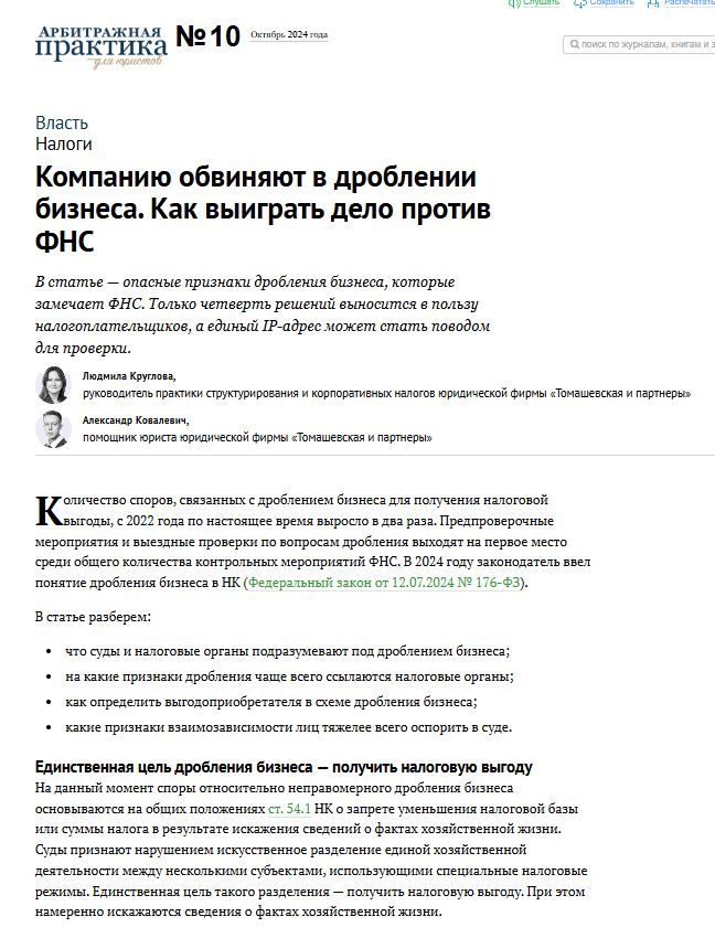 В статье — опасные признаки дробления бизнеса, которые замечает ФНС. Только четверть решений выносится в пользу налогоплательщиков, а единый IP-адрес может стать поводом для проверки.