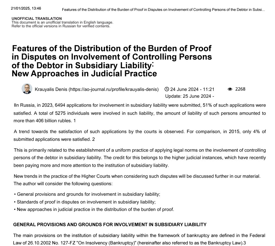 Features of the Distribution of the Burden of Proof in Disputes on Involvement of Controlling Persons of the Debtor in Subsidiary Liability: New Approaches in Judicial Practice