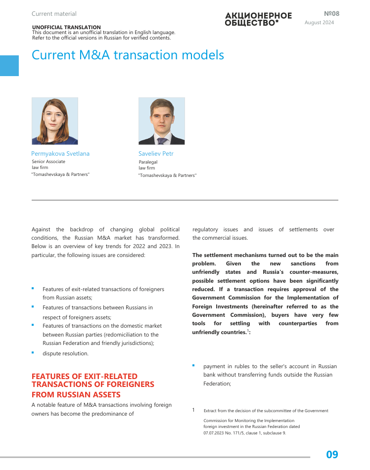 Against the backdrop of changes in the global political situation, the Russian M&A market has transformed. Below is an overview of the key trends for 2022 and 2023. In particular, the following issues are considered: