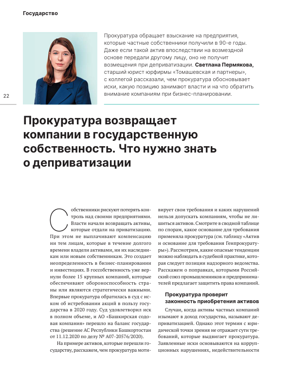 Прокуратура обращает взыскание на предприятия, которые частные собственники получили в 90-е годы. Даже если такой актив впоследствии на возмездной основе передали другому лицу, оно не получит возмещения при деприватизации. Светлана Пермякова, старший юрист юрфирмы «Томашевская и партнеры», с коллегой рассказали, чем прокуратура обосновывает иски, какую позицию занимают власти и на что обратить внимание компаниям при бизнес-планировании.