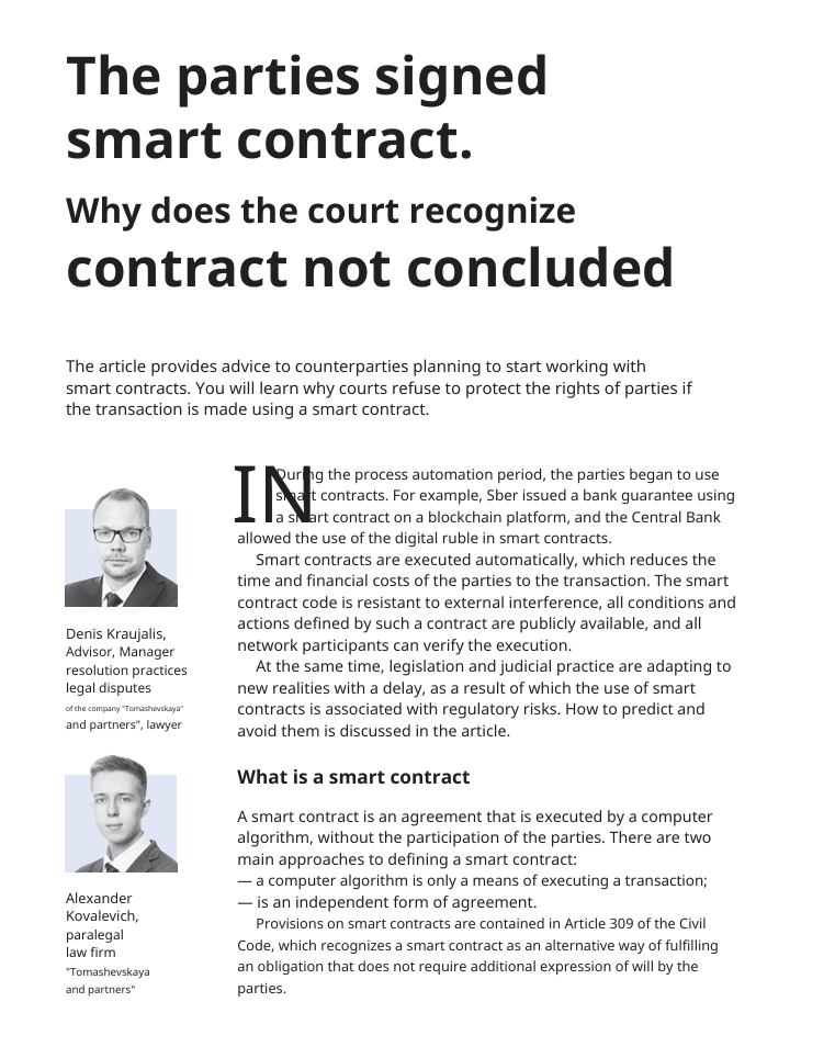 Discussion on the use of smart contracts, which are self-executing contracts with the terms directly written into code, and the associated legal challenges. The article explores the definition of smart contracts, their execution, potential applications, and the risks involved. It also provides strategies to mitigate these risks and outlines the current legal landscape and future prospects for smart contracts in the Russian legal system.