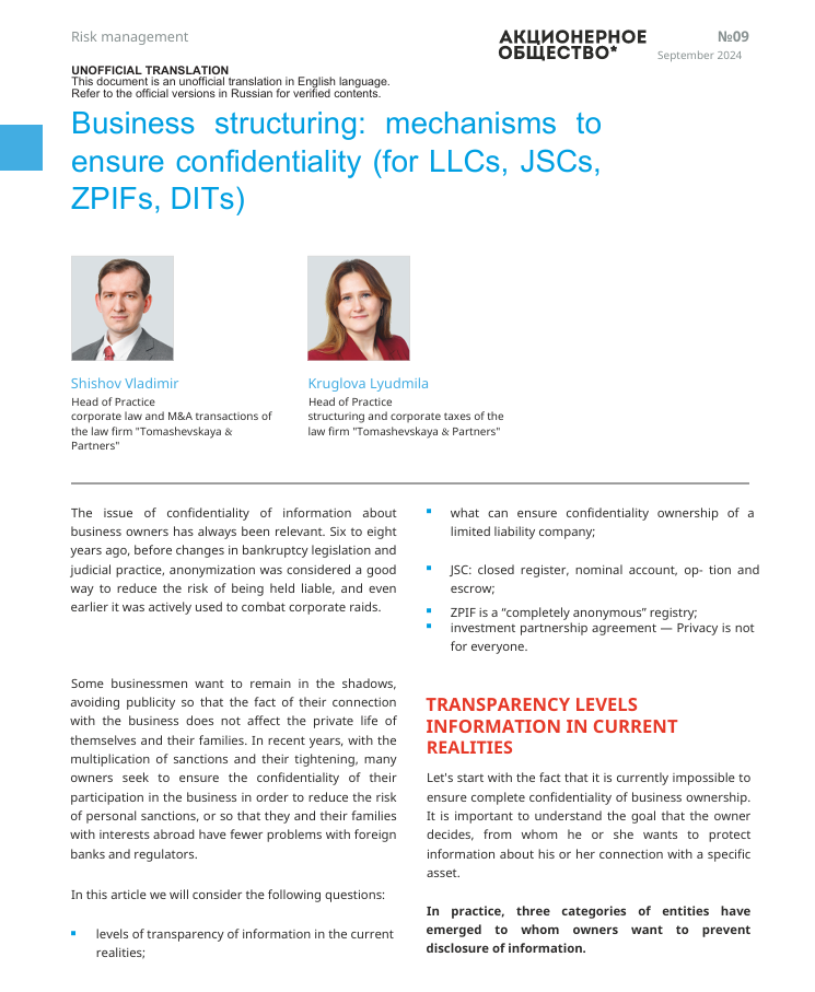 The issues of ensuring the confidentiality of business owners' information in Russia using various legal instruments. The authors analyze the current realities of information transparency and propose ways to protect confidential data for LLCs (Limited Liability Companies), JSCs (Joint-Stock Companies), CEFs (Close-end Funds), and PEs (Partnership Enterprises). Special attention is given to the risks associated with using nominal ownership, closed registers, options, and escrow mechanisms.